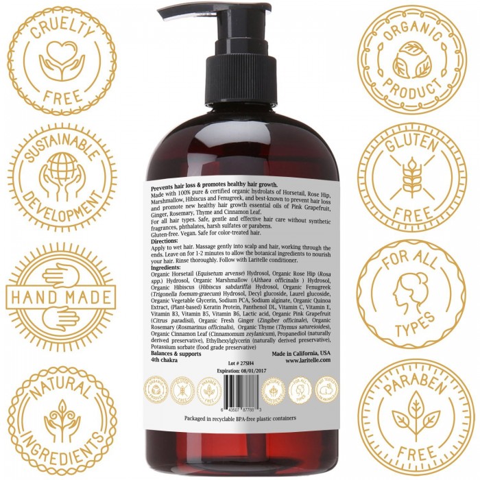 • ORGANIC SHAMPOO TO PREVENT HAIR LOSS & PROMOTE NEW HEALTHY HAIR GROWTH. Softens hair, nourishes the hair-shaft, rejuvenates hair follicles. Made with certified organic hydrolats of Horsetail, Rose Hip, Marshmallow, Hibiscus and Fenugreek, Vegan-friendly keratin protein, Quinoa protein, and best-known to prevent hair loss and promote new healthy hair growth essential oils of Pink Grapefruit, Ginger, Rosemary, Thyme and Cinnamon Leaf.